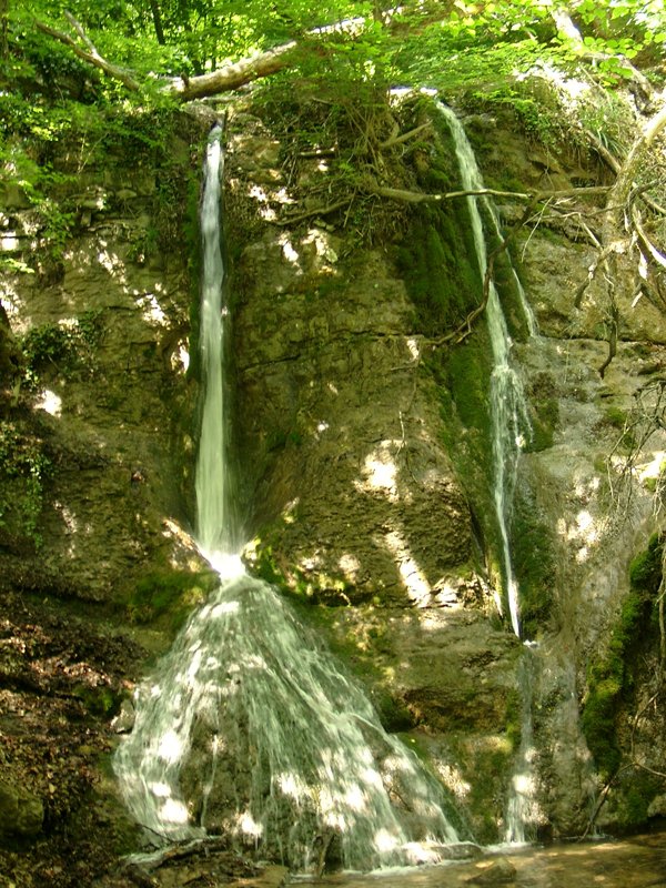 Через ~30 минут тропа подходит к небольшой смотровой площадке (1х2 метра) на левом берегу ручья. Тут же растёт толстый дуб, на нём – следы от верёвки. Высота обрыва – 10 метров. Но спуститься можно и пешком, по ручью, - тропа идёт по самим перекатам водопада. Под последним перекатом – небольшой грот.